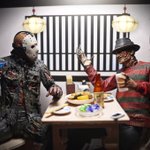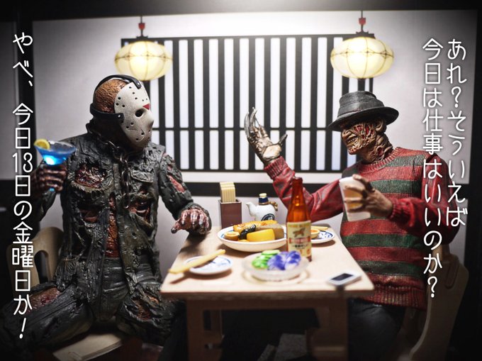 #夜のフィギュア撮影会 1/13 お題『ホラー』過去作 居酒屋で談笑するホラーアイコンのお二人。 「そういやお前今夜はこんなところで飲んでていいのか?」 「あら?今日13日の金曜日??やっべ、気づいてなかった!」 #FridayThe13th #13日の金曜日 #ANightmareonElmStreet #エルム街の悪夢 #neca