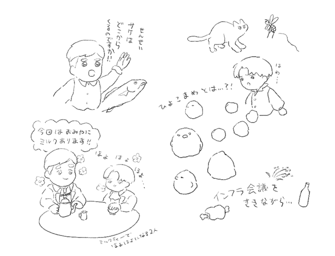 今回も楽しかったです☺ なぜ急に食事情が悪くなったんだろうと思っていましたがなるほどと思いました。ありがとうございました。衣も楽しみにしています! すごい落書きなのですが、紅茶をミルクティーにしてへいちょのご機嫌を取るエルビンが可愛いと思いました💖☺ #エルリインフラ会議