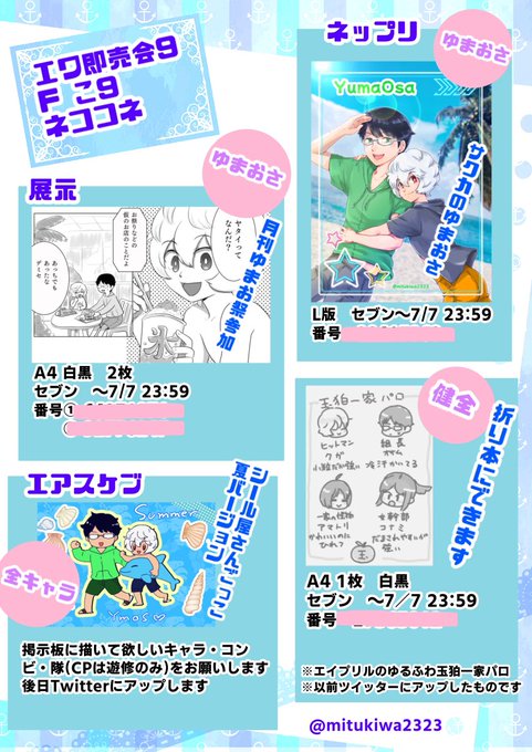 #エワお品書き202307 ネプリ番号は当日お知らせします🌺エアスケブもやってますので、遊びに来てください🏖️マンガはツイッターとpixivで展示、感想もらえるとホッとします〜 twitter.com/mitukiwa2323/s…