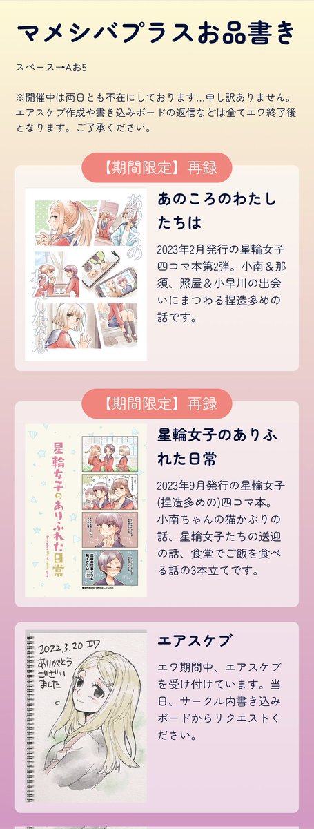エワ即売会(9)のお品書きです🍡 スペース: Aこ3 当日は短めの漫画をpixivで展示予定です! エアスケブも受け付け予定です! どうぞよろしくお願いいたします☺️✨ #エワ即売会 #エワお品書き202307