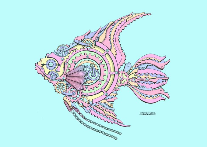 おはようございます✨✨ 3時起きの6時出勤はつらすぎ(^◇^;) 今日もよろしくお願いします♪ ⚙エンゼルフィッシュ⚙ #スチームパンクイラスト #歯車イラスト #ペン画 #エンゼルフィッシュ