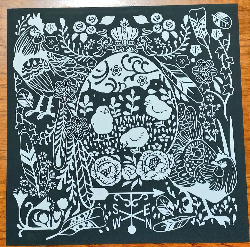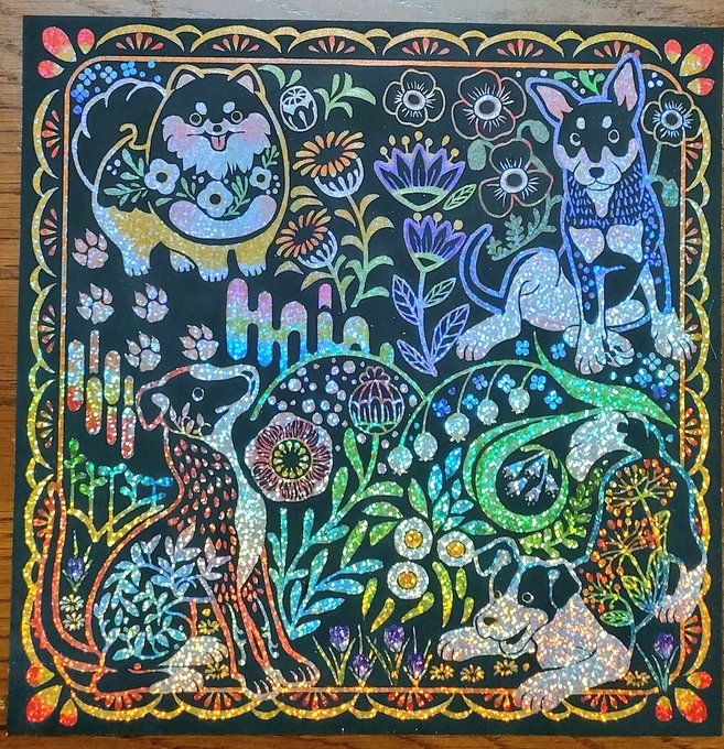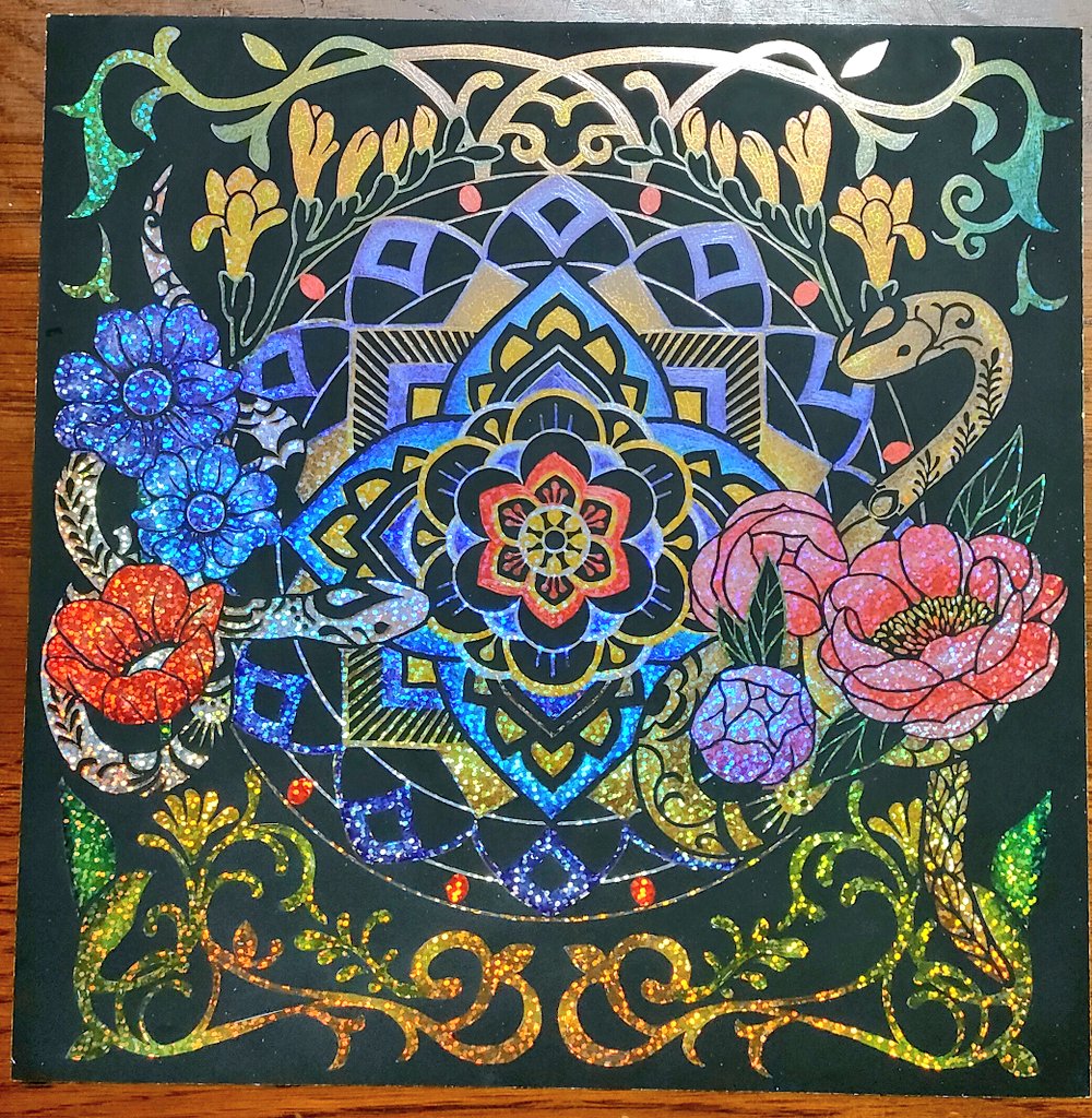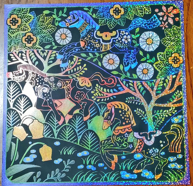 #スクラッチアート ✒︎ 「 #花と動物たちのファンタジー 」7枚目、ホログラムシートです🐝🍯🌹✨ 2023(R5).06.22(木)完成 #心がやすらぐスクラッチアート #scratchart #オオジカオリ さん #コスミック出版