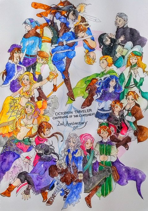 2周年記念おめでとうございます!! 今年も御祝出来て嬉しい〜😊 メインストーリー:全てを極めし者までをクリアした主なメンバーを環状に詰めてみました。来年は全てを授けし者クリアメンバーが描けると良いな😆 #オクトラ大陸の覇者 #オクトラ周年祭 #オクトラ芸術の覇者 【イラスト部門】