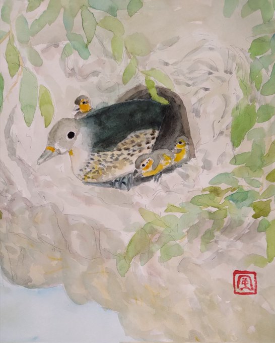 若冲みながら描いたオシドリ しっぽが短いです ポストカードに巧くおさめられないです 色調補正してます #オシドリ #illustration #ペン画 #伊藤若冲は神 #模写 #reproduction #mandarinduck
