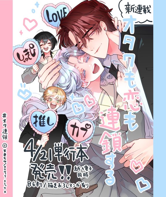【おしらせ】 💘『オタクも恋も連鎖する』💘 スクウェア・エニックス様より、以前載せた漫画(twitter.com/amairo_chu/sta…)の ◣単行本化&連載が決まりました!◢ 📖単行本 4/21発売/予約 amazon.co.jp/dp/4757584814 🗓連載 ガンガンpixivにて(連載開始日はまた後日おしらせします🕺🏾) #オタ連鎖 twitter.com/amairo_chu/sta…