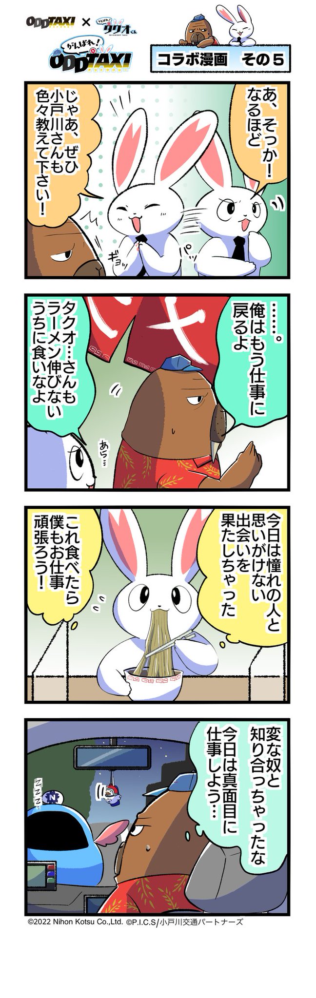 #オッドタクシー と #がんばれタクオくん のコラボ漫画🐰 本日 最終話です! ここから 小戸川さんとタクオくんの運命が始まったり……始まらなかったり😂 1週間楽しんでいただけましたか? 感想お待ちしています\♪/ #オッドタクシーX日本交通 #漫画が読めるハッシュタグ #キャンペーン実施中