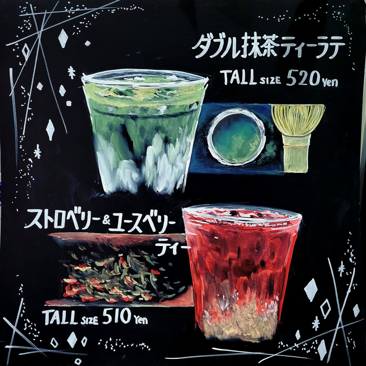 今日から発売の新作ボードも担当させていただきました✨ #スタバの新作 #抹茶玄米茶もちフラペチーノ #ブラックボード #オファリングボード #イラスト #illustration #artwork #チョークボード #絵描き