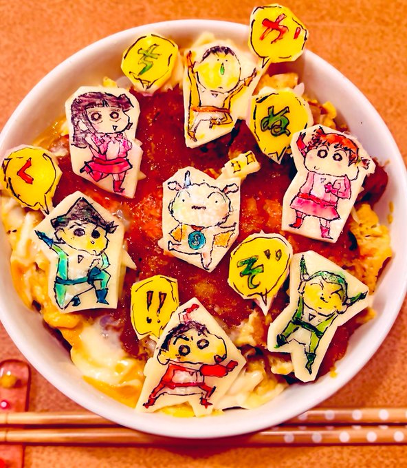 クレヨンしんちゃんの応援カツ丼❗️ 「オラたちがいるぞぉ~✨✨」 #料理好きな人と繋がりたい #キャラ弁 #お弁当 #アニメ #クレヨンしんちゃん #オブアート #イラスト #おうちごはん