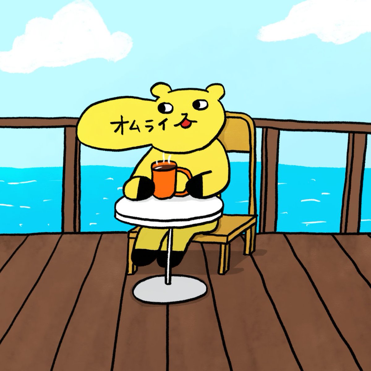 海が見えるカフェでコーヒーを飲むオムライスくん!毎日オムライスくん320日目。 #オムライス #ゆるキャラ #illustration #絵 #illustrations #illustrator #毎日オムライスくん #オムライス町 #絵描きさんと繋がりたい #オムライスさん #海辺 #海 #カフェ #コーヒー #晴れ