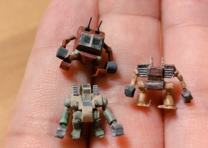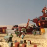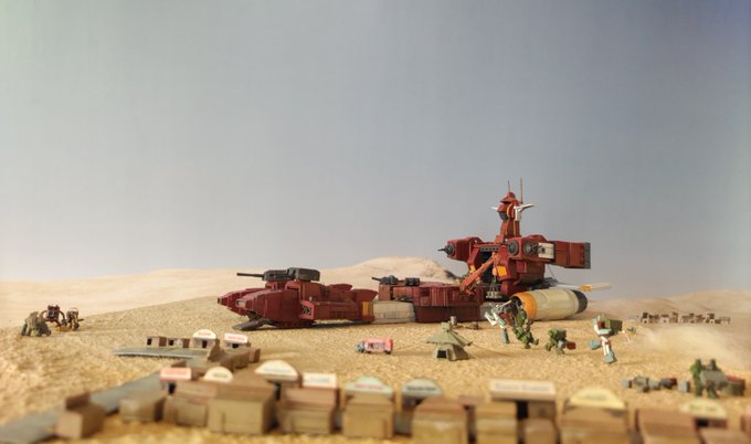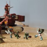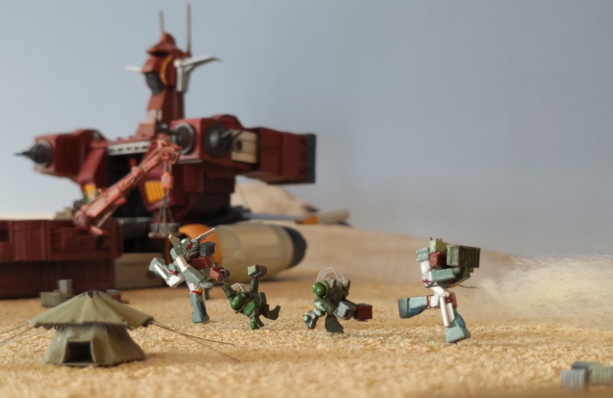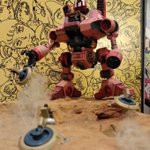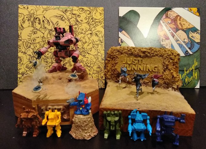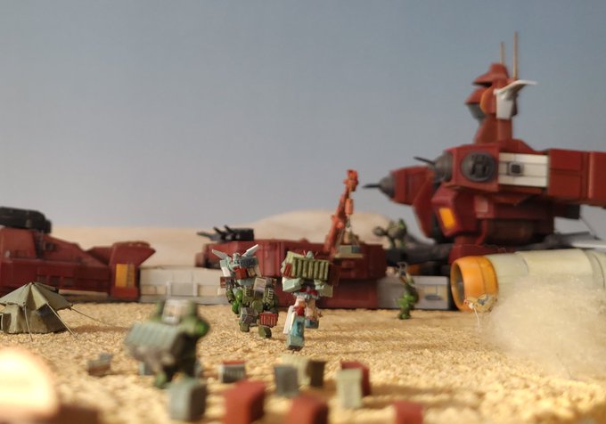 #オラザブ3バザー編完成 #オラザブ3バザー編 先頭のジロン機は運転席からの視界が完全に塞がってますが、まあザブングルならこれもアリだろうと(´▽`) 続くトラッドにブルメ、その後ろでコケてるのがハイヤ、最後尾はラグの設定。 ダイク? ダイクは人力で何かやってるはず。 サブキャラだからね