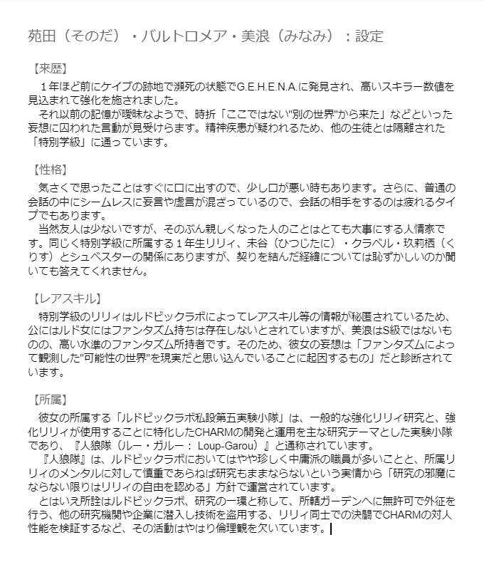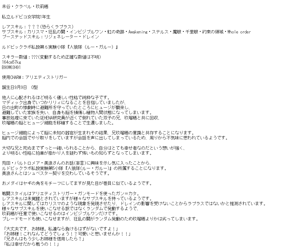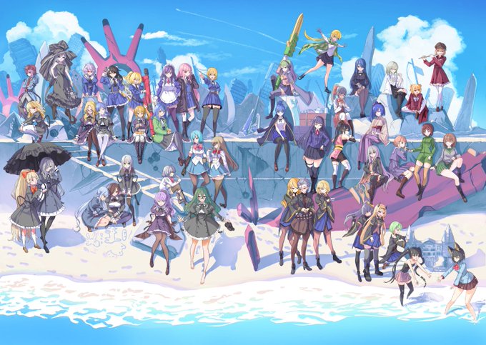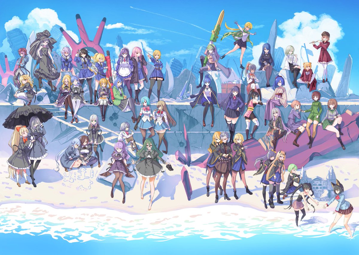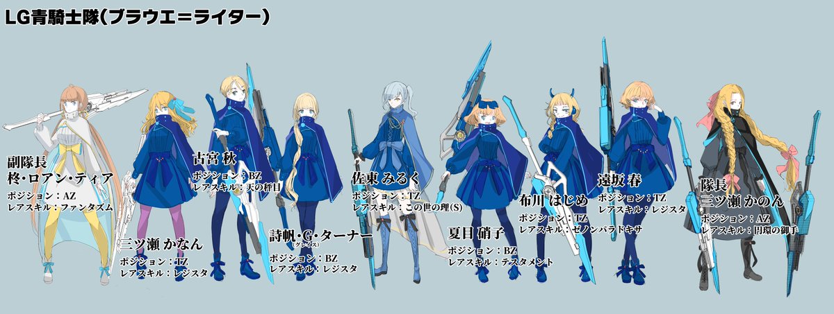 やっとLG全員の名前が決まりました。AZの2人が自由に動いて残り7人がトリプルレジスタで集団戦をするレギオンです。副隊長の柊ちゃんは粉茉茶先生、作戦指揮担当のみるくちゃんは青砥ミズさんデザインで残りは私。超かっこいいCHARMは鍛冶さん作です。 #オリジナルリリィ合同