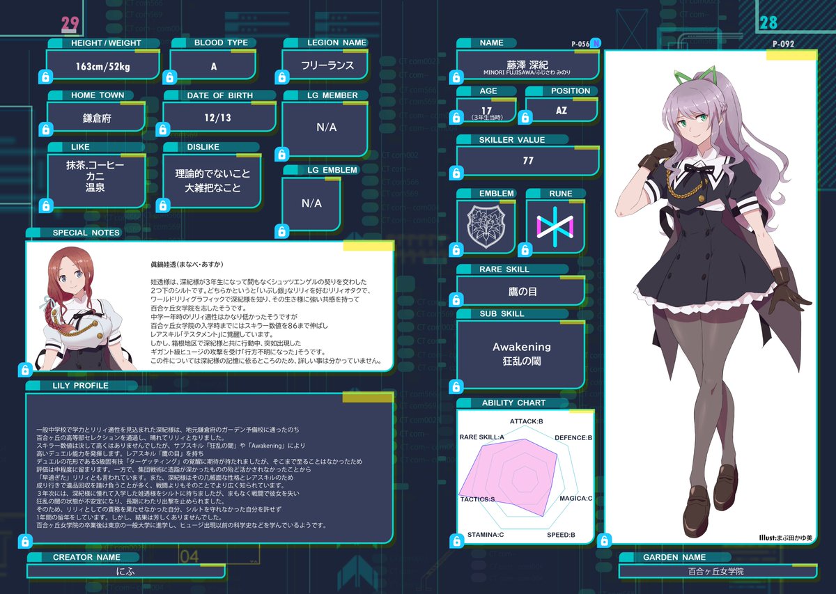 紹介11人目!アサルト太ももNo1まぶかゆ氏の絵が上手いんだわ……設定も超凝っててちょっといじりたい……って言われて修正依頼データでスキラー数値1違ってた時、本物やな……って思いました。 #オリジナルリリィ合同