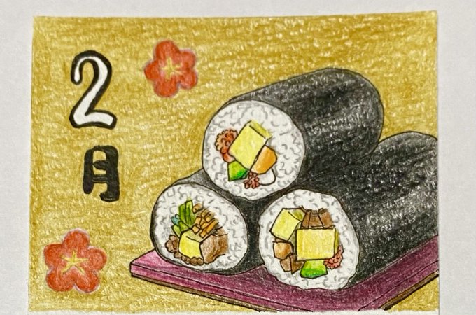 今日は節分です。今年は「北北西のやや北」を向いて恵方巻きを食べます。 #恵方巻き #イラスト #絵画 #色鉛筆 #絵描きさんと繋がりたい #みんなで色鉛筆イラスト見せ合おうよ #みんなで楽しむTwitter展覧会 #オリジナル塗り絵作ります