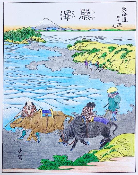 浮世絵「東海道五十三次」の、先日塗っていた分が完成しました。 この絵の場所は、現在の神奈川県藤沢市です。 #イラスト #絵画 #色鉛筆 #絵描きさんと繋がりたい #みんなで色鉛筆イラスト見せ合おうよ #みんなで楽しむTwitter展覧会 #オリジナル塗り絵作ります