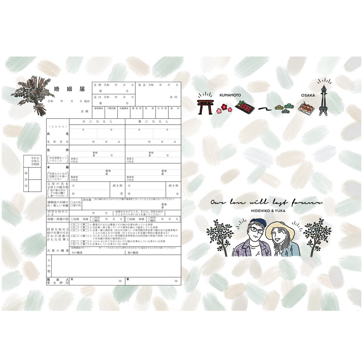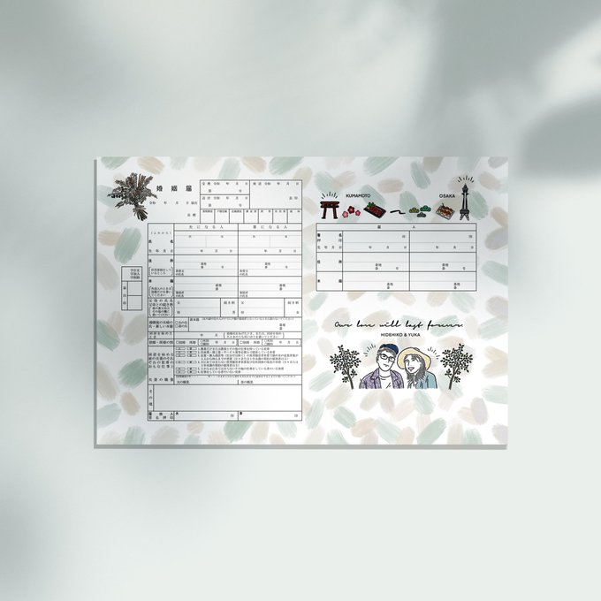 【オーダーメイドオリジナル婚姻届】熊本県&大阪府出身のお2人。思い出の地のイラストを添えて🌿改めてご入籍おめでとうございます♡※ご本人様以外のご利用はご遠慮ください #絵描きさんと繫がりたい #絵柄が好みって人にフォローされたい #秋の創作クラスタフォロー祭り #オリジナル婚姻届