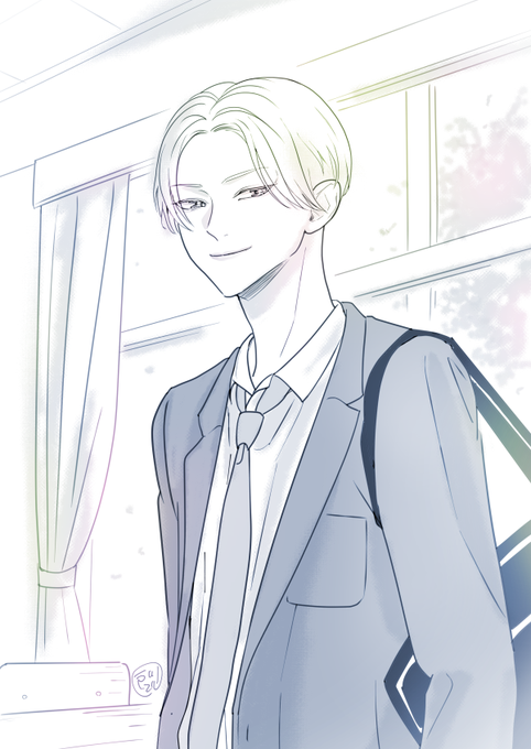 今日あたり、進学・入学・入社シーズンだったということで、高校生の圭太描きました。クラスメイト(♂)に「また同じクラスだね」とか言ってる感じ?彼フィルターがかかっている(ちょっと好かれていたらしい)。 入学とかした方も、何もない方もみんなおめでとう。 #創作BL #オレが脱ぐなんて聞いてない