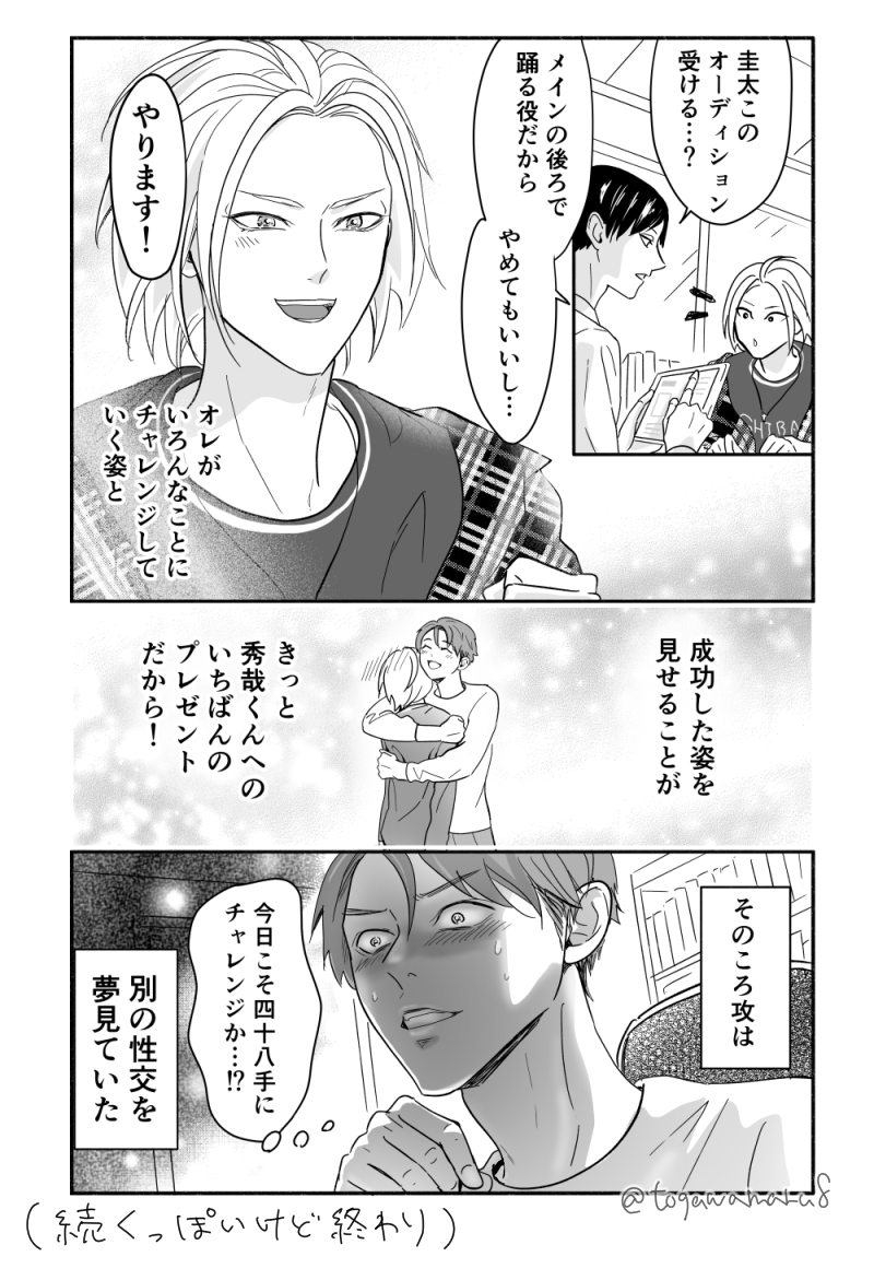 事務所の先輩・黒崎さんと圭太ラスト③ お約束展開で回収しました。(②twitter.com/togawamaru8/st…) #創作BL #オレが脱ぐなんて聞いてない #漫画が読めるハッシュタグ
