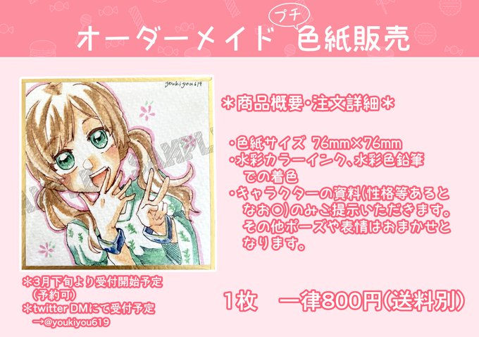 【予告】 3月下旬(25日頃)より、プチ色紙の制作販売を開始致します。 概要は添付画像の通りです。 キャラクター以外はおまかせ・76mm四方の小色紙のため、一律800円となります。 より細かな指定を要するご依頼は料金が異なりますのでご相談ください。 #オーダーメイドイラスト #イラスト制作