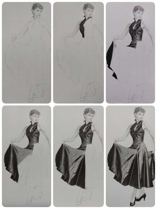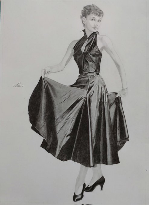 こんばんは(*ˊᵕˋ*)ノ たくさんのいいね❤RTありがとうございます(⁎ᴗ͈ˬᴗ͈⁎) 制作過程です_φ(・∀・ )♪ #鉛筆画 #シャーペン画 #模写 #アナログ絵 #オードリー・ヘップバーン #いつもありがとうございます