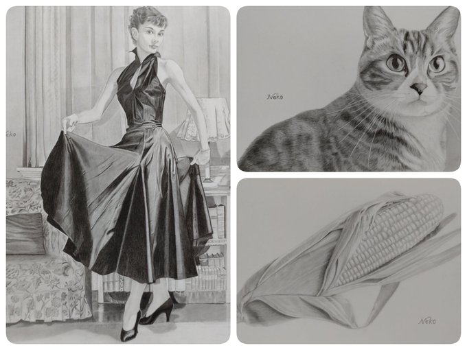 #8月の終わりにあなたの作品見せてください おはようございます(*^^*) 私明日はお休みなので今日一日頑張ります 皆さま素敵な一日をお過ごしください(^^♪ #鉛筆画 #シャーペン画 #模写 #過去絵 #オードリー・ヘップバーン #ダニエル・ラドクリフ #腕時計 #猫 #花 #水 #パンケーキ