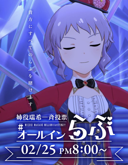 MILLION C@STING!!! 『現代伝奇ホラー』の『姉役』真壁瑞希を支援する企画 2/25・PM8:00より予定の一斉投票 「オールインらぶ」の応援用ロゴを配布します。 私的利用の範囲内で自由にお使い下さい! #オールインらぶ #ミリオンキャスティング #MC真壁瑞希