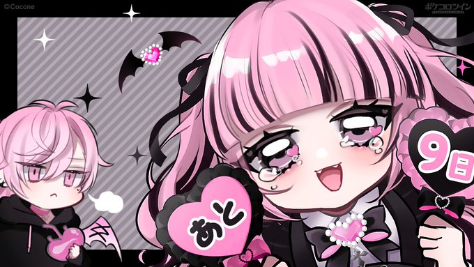 🎨3周年記念カウントダウンアート🎨 / #ポケコロツイン 3周年まで あと 9日! \ 2022年4月に登場した「Pretty♡Vampire」のヴァンパイアちゃんは 今日も推し活に一生懸命🎀✨ 手作りうちわで3周年の準備はカンペキです🖤 #3周年記念 #カウントダウンアート #PrettyVampire