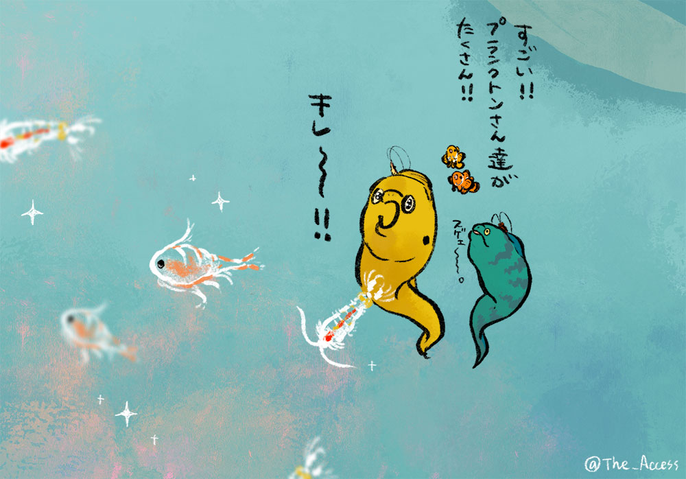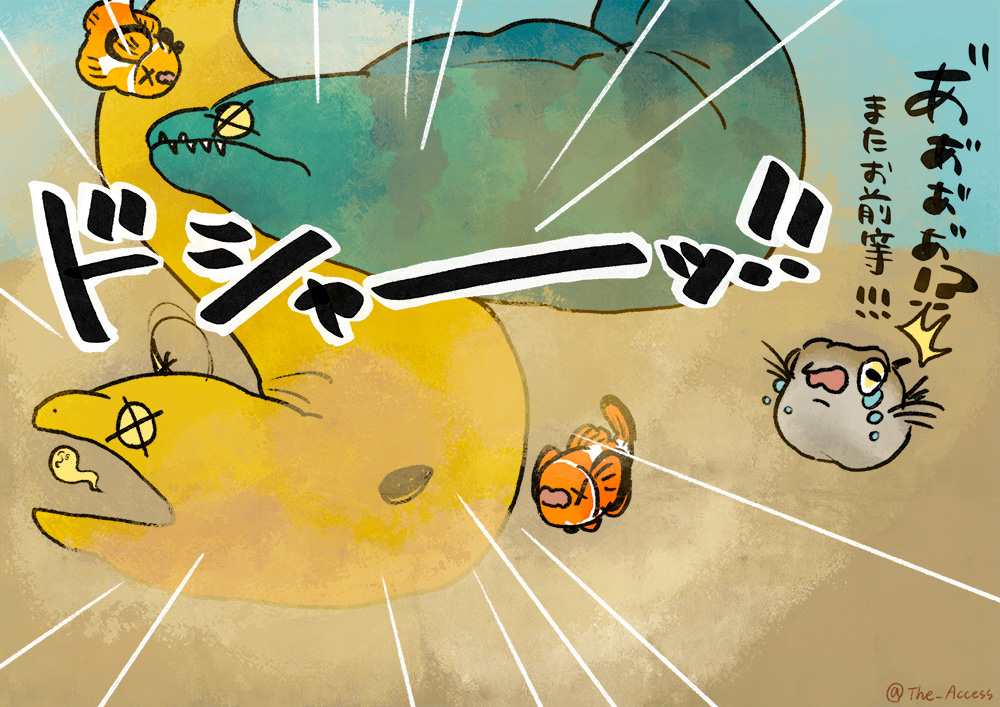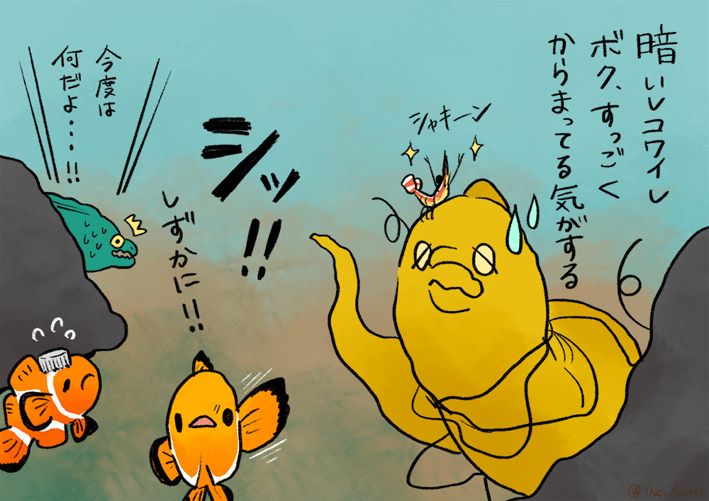 【何も知らないウツボ65】 「ダブルピンチ!」 #何も知らないウツボ #ウツボ #カクレクマノミ #イセエビ #アカシマシラヒゲエビ #ジンベエザメ #イラスト #漫画 #The_Access