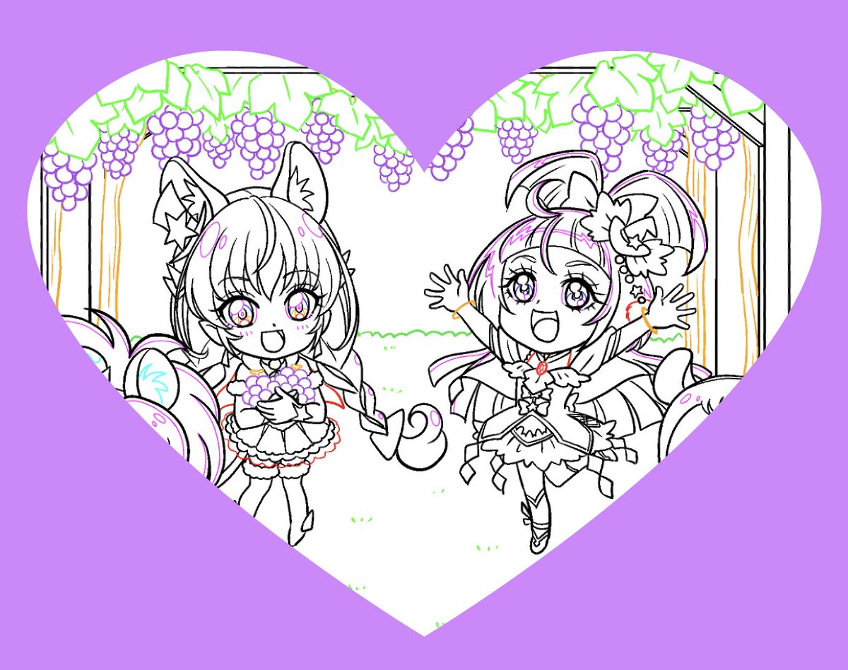 #プリキュア オールスターズ×おいしい笑顔シリーズ😋 キュアコスモとキュアマジカルのデリシャスマイル〜💗 今日は #カシスの日❣️ イラストはぶどうです(笑)が、どちらも甘酸っぱくて美味しくて大好きなのでアップ🍇 講談社さんの #プリキュアオールスターズ 知育えほんで描いたイラストの線画です✨