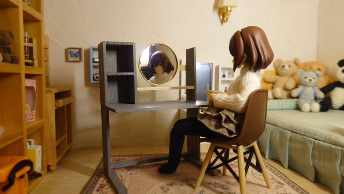 うむ、鏡がようやく納得のいくサイズになった。やっぱりドールを目の前に座らせて、映らないと化粧台の意味がない。 1/12美女達の為、これを次回AKの為に準備だな #アサルトリリィドール部 #カスタムリリィ