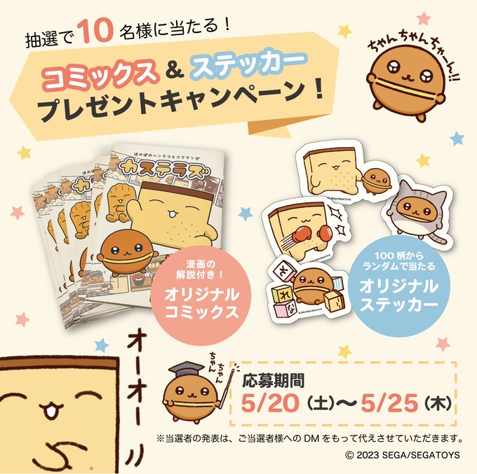 #カステラズ のコミックスとステッカーが当たるキャンペーンです🎁 〈応募方法〉 1️⃣このアカウント(@ippai_iruyo)をフォロー 2️⃣この投稿をリツイート 〈期間〉 5月25日(木) 23:59まで 利用規約 segatoys.co.jp/campaign/follo… ご応募お待ちしています✨