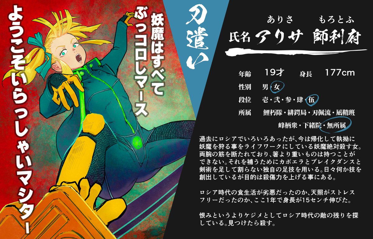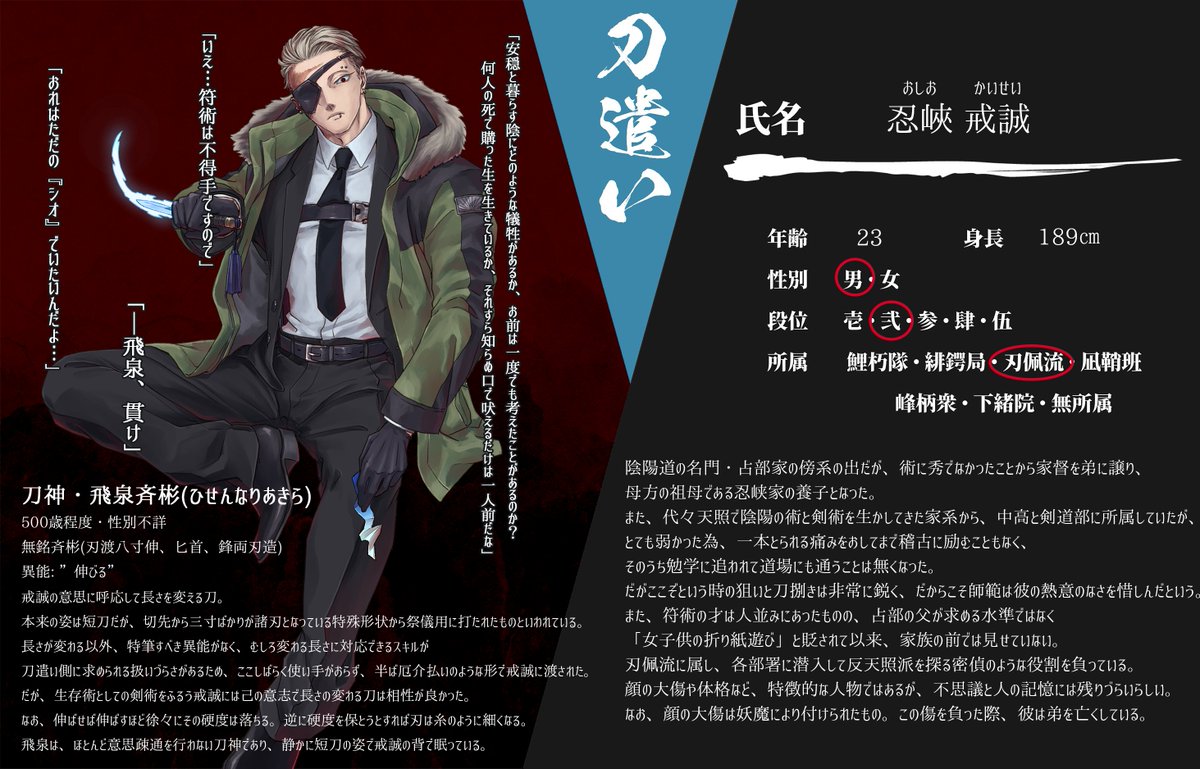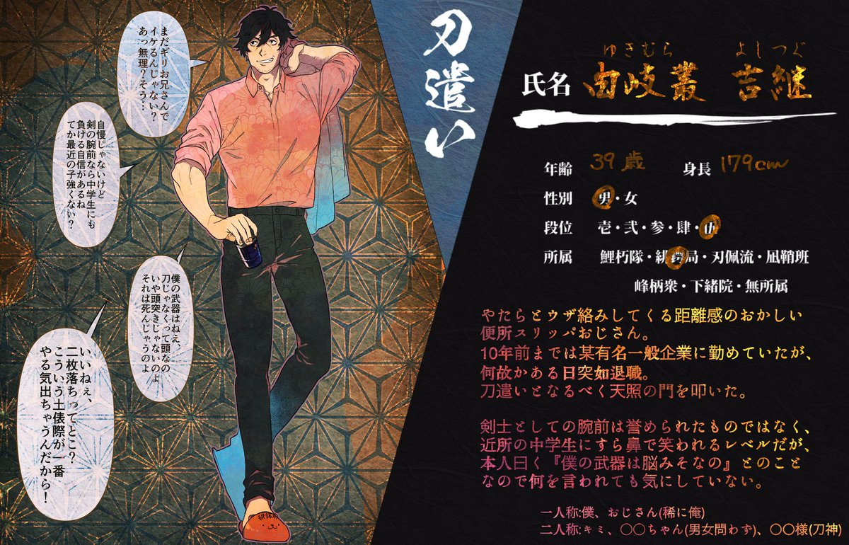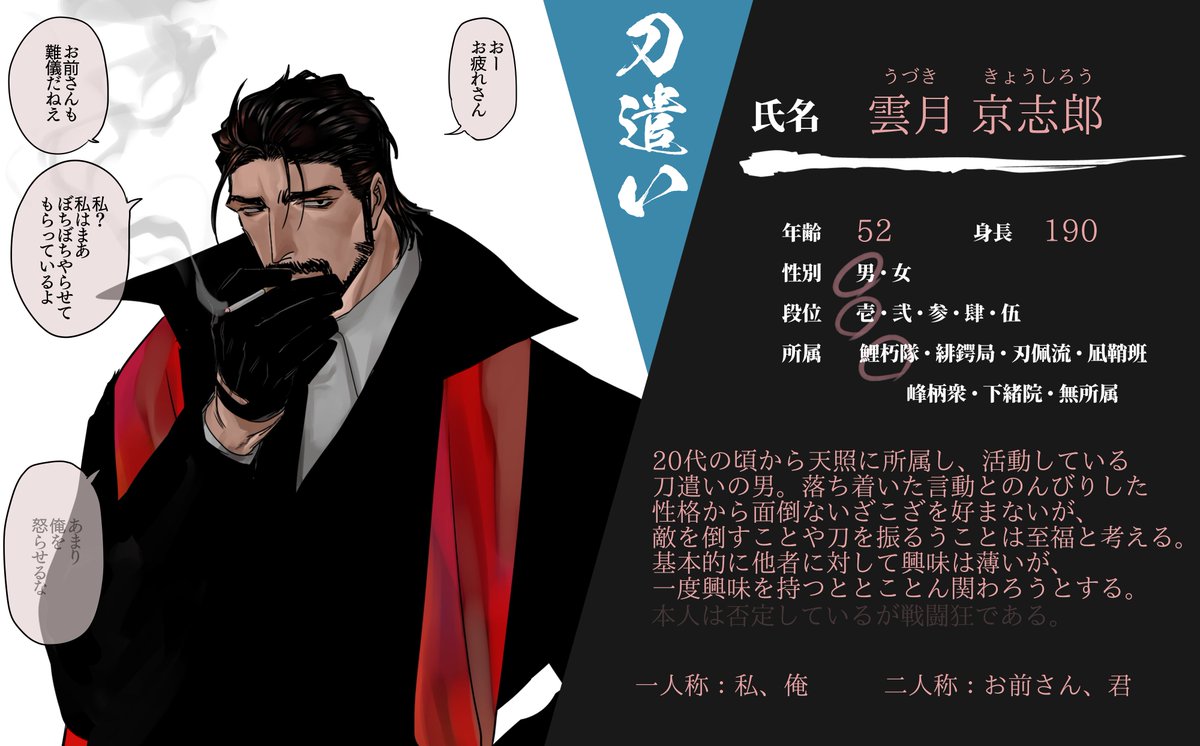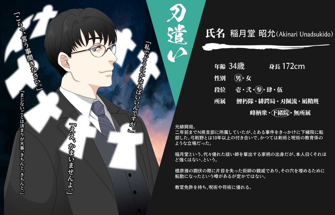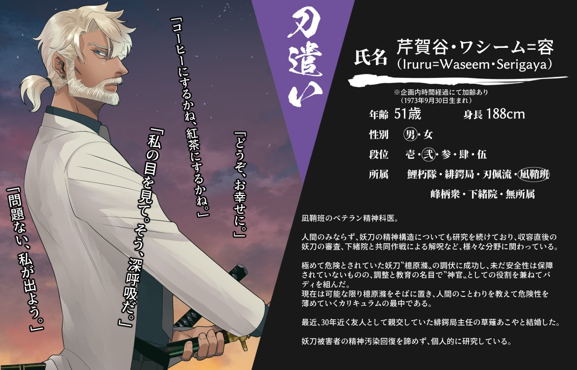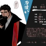 創作企画・刀神(@KATANAGAMI_TL)様に参加中のキャラクターに情報の更新がありましたので、新しいCSを投稿させて頂きます。 相変わらずのスットコドッコイおじさんですが、どうぞよろしくお願い致します。 #カタナガミ_CS #カタナガミ_刀遣い #カタナガミ_緋鍔局