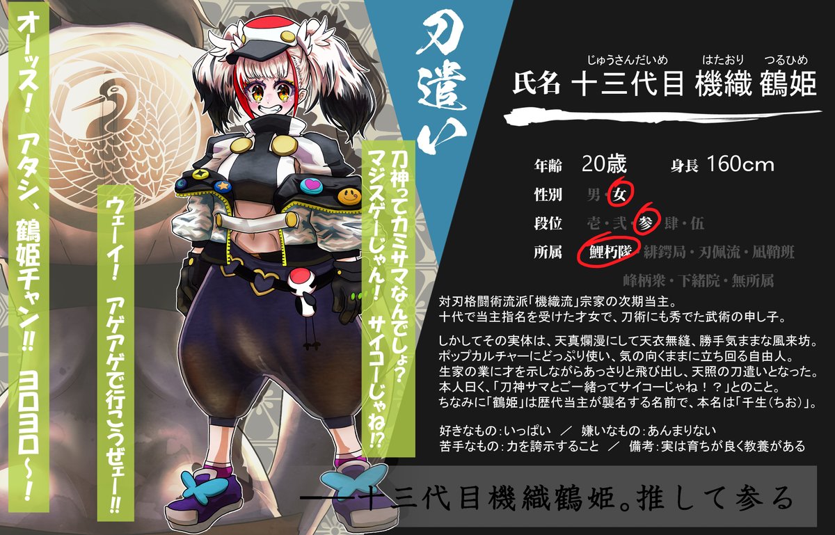 【@KATANAGAMI_TL】こちらの企画に3人目を参加させたく思います。 陽キャ系ギャルの武術家娘です。関係まっさらですので、仲良くしてやってもらえると嬉しいです。 よろしくお願いします。 #カタナガミ_CS #カタナガミ_刀遣い #カタナガミ_鯉朽隊