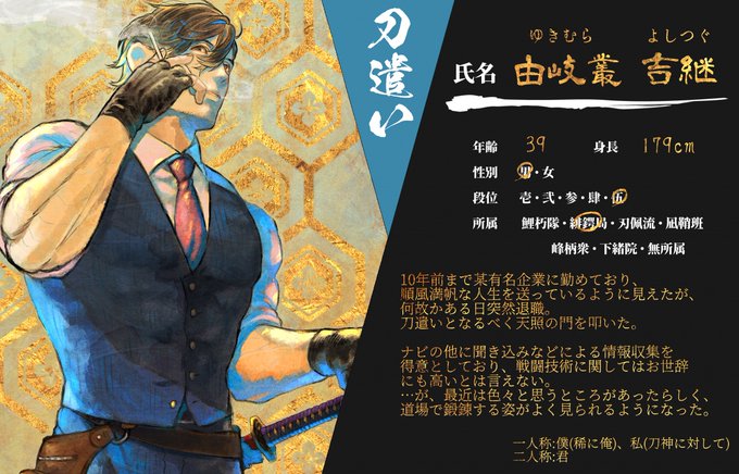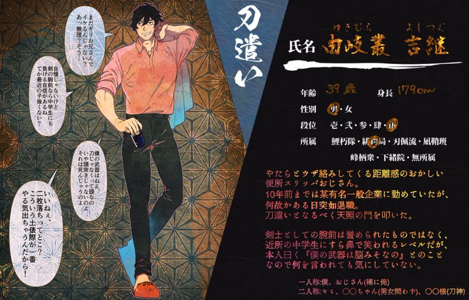 創作企画・刀神(@KATANAGAMI_TL)様に三人目の刀遣いを投稿させて頂きます。 スットコドッコイおじさんです。どうぞよろしくお願い致します。 #カタナガミ_CS #カタナガミ_刀遣い #カタナガミ_緋鍔局