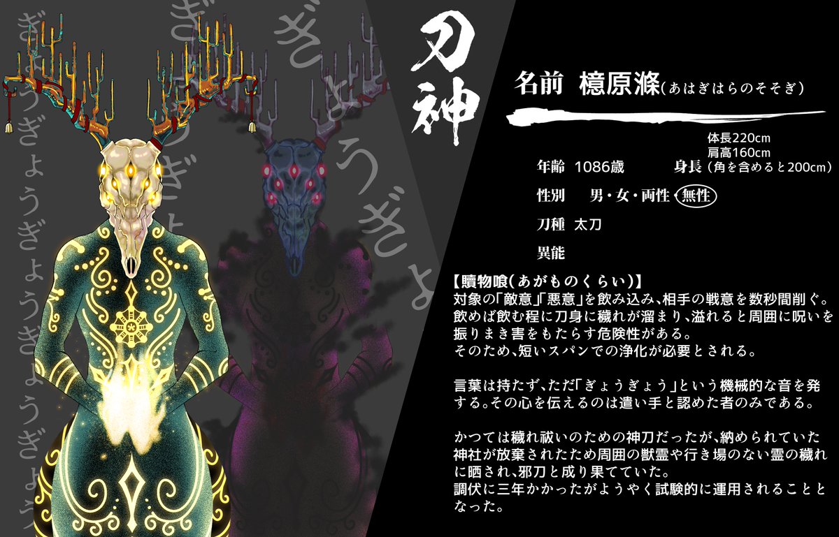 刀神 @KATANAGAMI_TL こちらのTwitter企画に懲りずに9体目失礼します。 ※:神と遣いのタグを間違えてました、再投になります。 ゴリラ式神使いです。 投稿時点でオールフリーとなります。 #カタナガミ_CS #カタナガミ_刀遣い #カタナガミ_下緒院