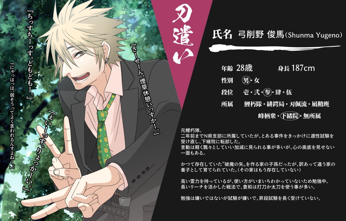 @KATANAGAMI_TL 6キャラめ投下させていただきます。チャラい言動の新人下緒メンです、どうぞよろしくお願いします。 #カタナガミ_CS #カタナガミ_刀遣い #カタナガミ_下緒院