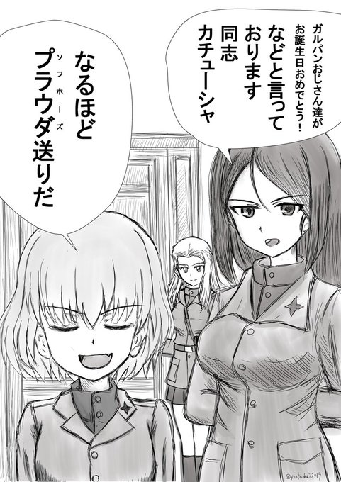 ノンナ:私からのささやかなプレゼント「等身大カチューシャパネル」です カチュ:へー中々良くできてるじゃない。ありがと😊 ノンナ:私のコレクションで同じのがあと50個程あります カチュ:えっ ノンナ:はい カチュ:はいじゃないわよ… #カチューシャ生誕祭 #カチューシャ生誕祭2023