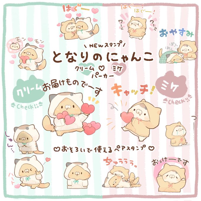 🌟新作スタンプ🌟 となりのにゃんこ クリーム♡パーカー line.me/S/sticker/2098… ミケ♡パーカー line.me/S/sticker/2098… ペアで使えるスタンプです🐱 よかったら覗いてみてください✨ #LINEスタンプ #となりのにゃんこ #ミケクリ #カップル