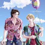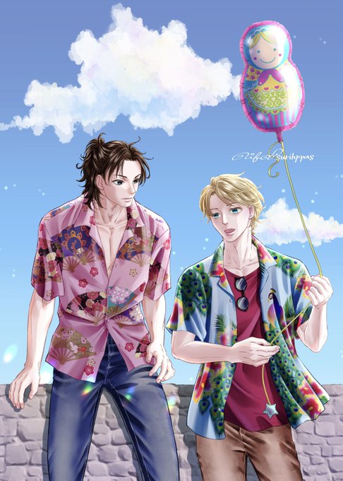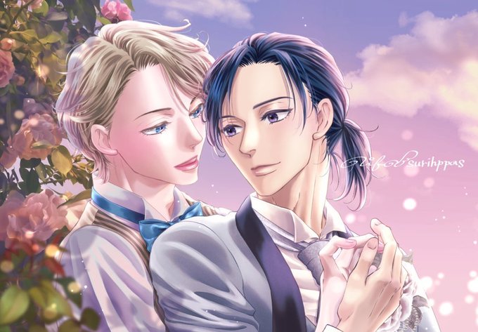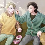 #ゴールデンウィークSNS展覧会2022 #創作BL #繋がらなくていいから俺の絵を見てくれ #カナタとサーシャ 🪆の顔すんごい細かくいっぱい調整した…3回目💉で微熱だけど頑張った。🍣の背景にも花足してみた🌸🌼