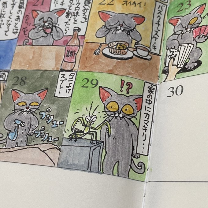何故か家のリビングにカマキリ氏がいた… #カマキリ #1日1絵 #水彩画 #手帳 #トラベラーズノート #猫 #スケッチジャーナル #マンスリージャーナル #絵 #イラスト #絵描きさんと繫がりたい #イラスト好きな人と繋がりたい