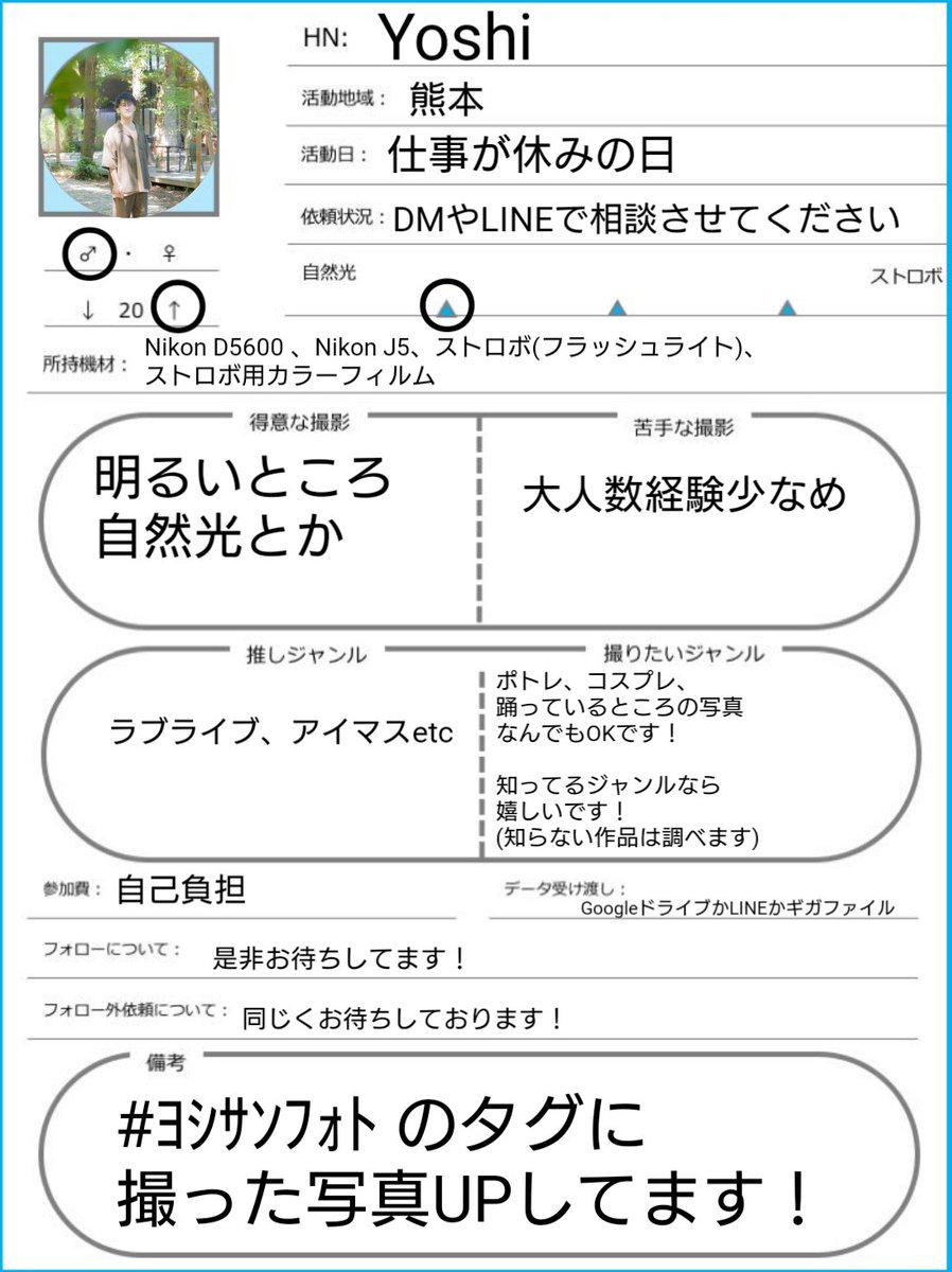 熊本を中心に九州内外で撮影してます! コスプレ撮影、ポトレ撮影問わず被写体様を募集しております! ぜひお声がけください!! #ヨシサンフォト に撮った写真上げてます! #カメラマンプロフィール #ファインダー越しの私の世界 #コスプレイヤーさんと繋がりたい #カメラのある生活