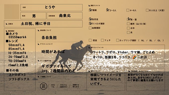 近々イベントや新しくお会いする方もあるかもしれないのでカメラプロフ作成しました! 主にコスプレと創作を撮影するカメコです!またROMも再開したいので、色んな被写体の方やカメラマンさんとも繋がれると嬉しいです! #カメラプロフ #コスプレイヤーさんと繋がりたい #カメラマンさんと繋がりたい