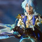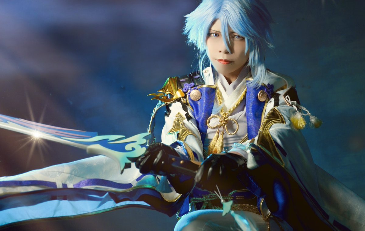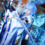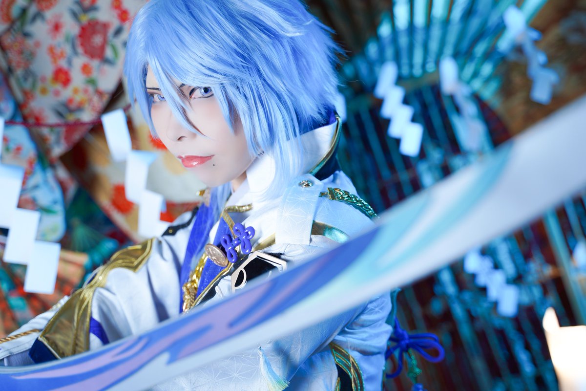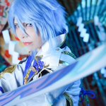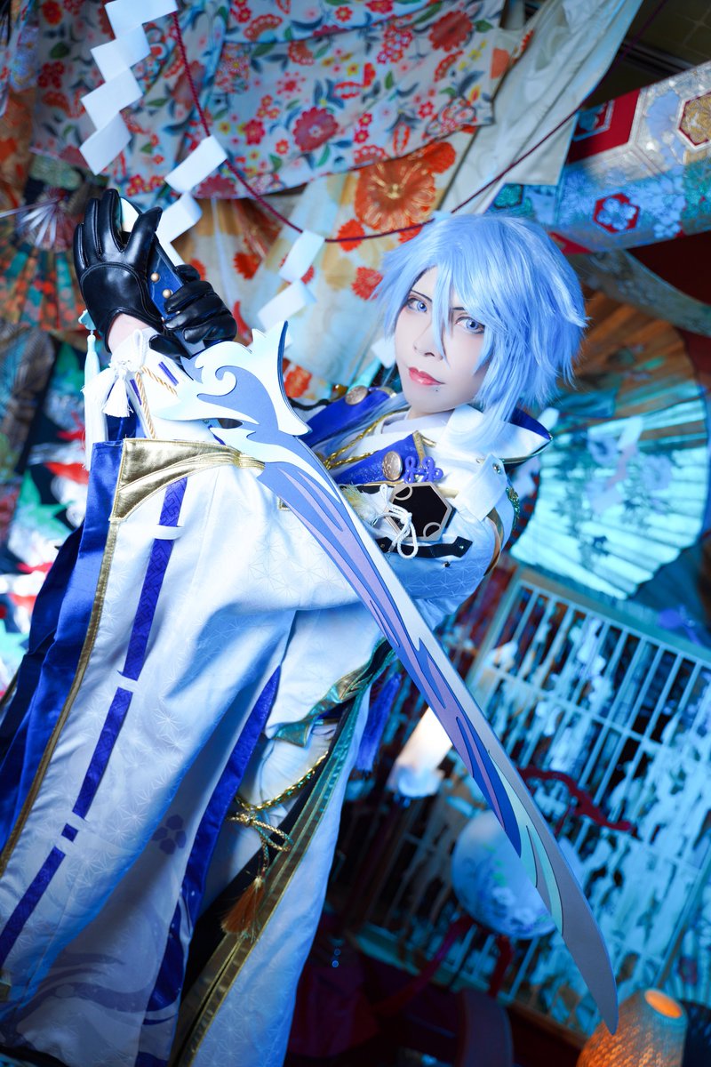 原神コス 🌸💧神里綾人💧🌸 ハコアムでカメラマンサービス使ったら 刀構えたやつこんなカッコよく撮って下さいました ありがとうございました☺🙏 撮影📸蒼緑こはくさん #ハコアム大阪 #カメラマン撮影サービス
