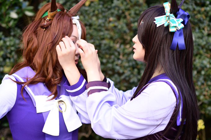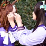 ウマ娘 Cosplay メジロドーベル メジロ家併せでの1枚! メジロパーマーの前髪を直している私をカメラマンさんが撮っててくれましたw オフショ由来の自然体な表情が1番平和っぽいヾ(*´∀`*)ノ #カメラロールから1番平和そうな写真をあげる #cosplay #アコスタ池袋 #ウマ娘になってしまいました