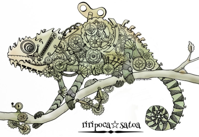 お疲れ様でした✨✨ ゆっくりお過ごし下さい♪♪♪ ⚙メカメレオン⚙ #スチームパンクイラスト #歯車イラスト #カメレオン #ペン画 #今日もありがとうございました #アトリエの系譜S #アトリエの系譜plus
