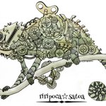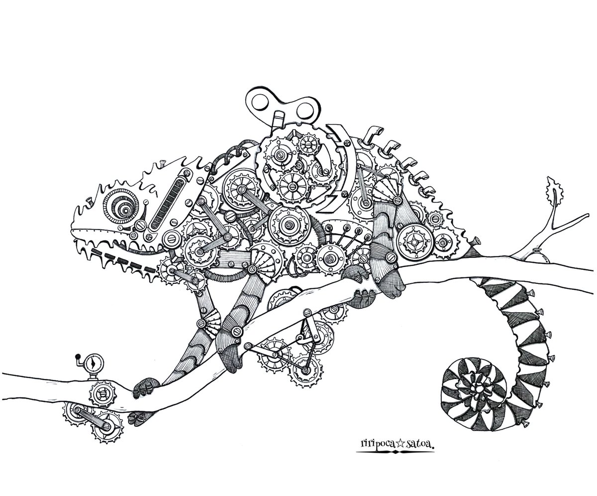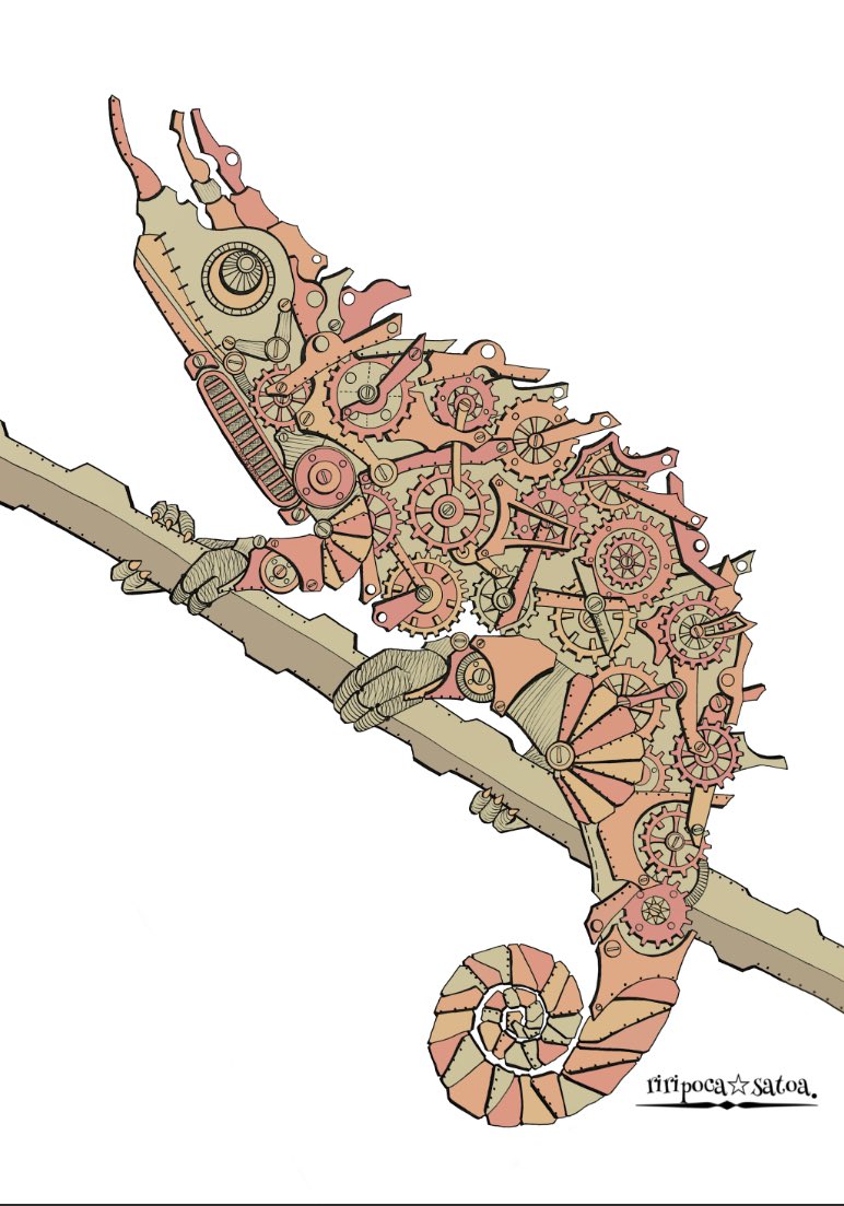 お疲れ様でした✨✨ 暑いのか寒いのか全くわかりません〰︎T^T ⚙メカメレオン⚙ #歯車イラスト #スチームパンクイラスト #ペン画 #カメレオン #絵師さんと繋がりたい #作品を観てくれてありがとう