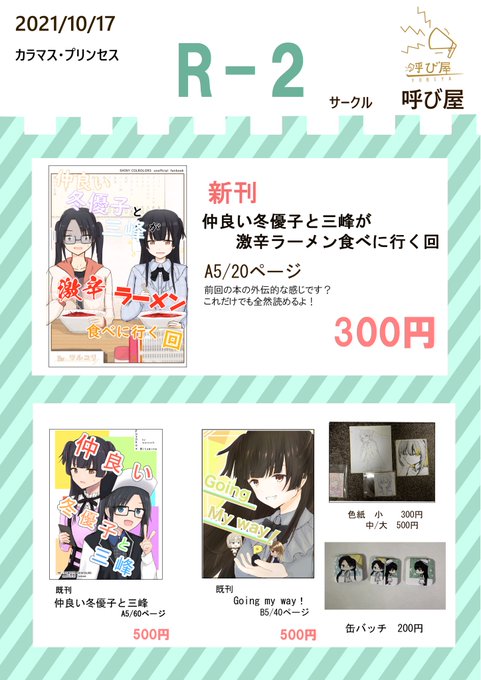 明日開催カラマスプリンセス(カラマス12)のお品書きです。 他にも既刊、既存グッズ色々持っていきます〜 消毒ディスペンサーご用意しておりますので、ガチャガチャご利用の際は必ずご利用下さい。 新刊サンプルはこちら twitter.com/makaami/status… #カラマス #カラマス12