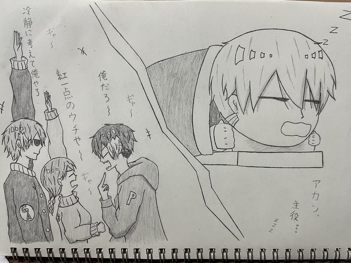 #落書き #お絵描き #イラスト #オリキャラ #カラーヒューマンズ #リトルグレープ参上! ✨3000人感謝イラスト裏側✨ 熟睡したリトル君の代わりに急遽呼ばれたカラーヒューマンズの醜い争い。 PM:俺こそセンター! GA・RB:意義あり!!!