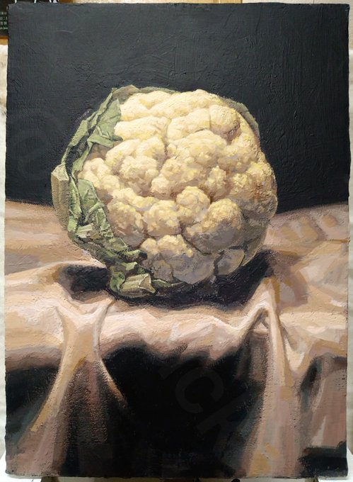 久々ニモチーフ(カリフラワー)ト 対峙シナガラ、ジックリト 制作出来マシタ… _φ(・_・) 水彩紙にジェッソ、アクリル絵具 F4号(33.3 × 24.2㎝) ↓My painting🎨🖌️ #アクリル絵具 #アキーラ #カリフラワー #art #artwork #acrylicpainting #絵描きさんと繫がりたい #みんなで楽しむTwitter展覧会