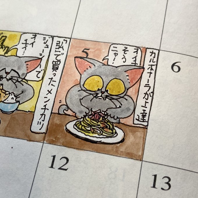 カルボナーラが上達してきた。 #カルボナーラ #水彩画 #手帳 #トラベラーズノート #猫 #スケッチジャーナル #マンスリージャーナル #絵 #イラスト #イラスト好きな人と繋がりたい #絵描きさんと繋がりたい