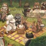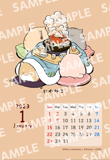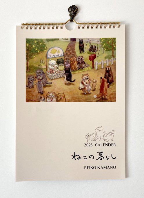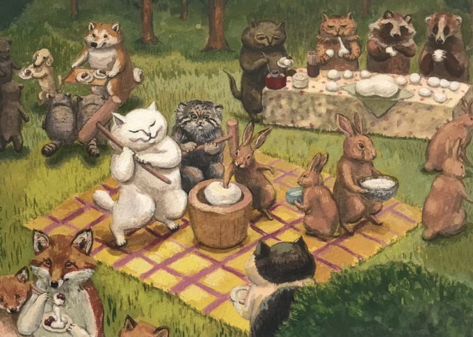 2023年カレンダーの一月の絵は、 「もちつき」です。 いつものメンバーとうさぎで、たくさんのお餅を皆にふるまっています。 うさぎは猫や犬と形が違っていて、描いていてたいへん面白かったです🐇 #猫 #カレンダー kamano.booth.pm